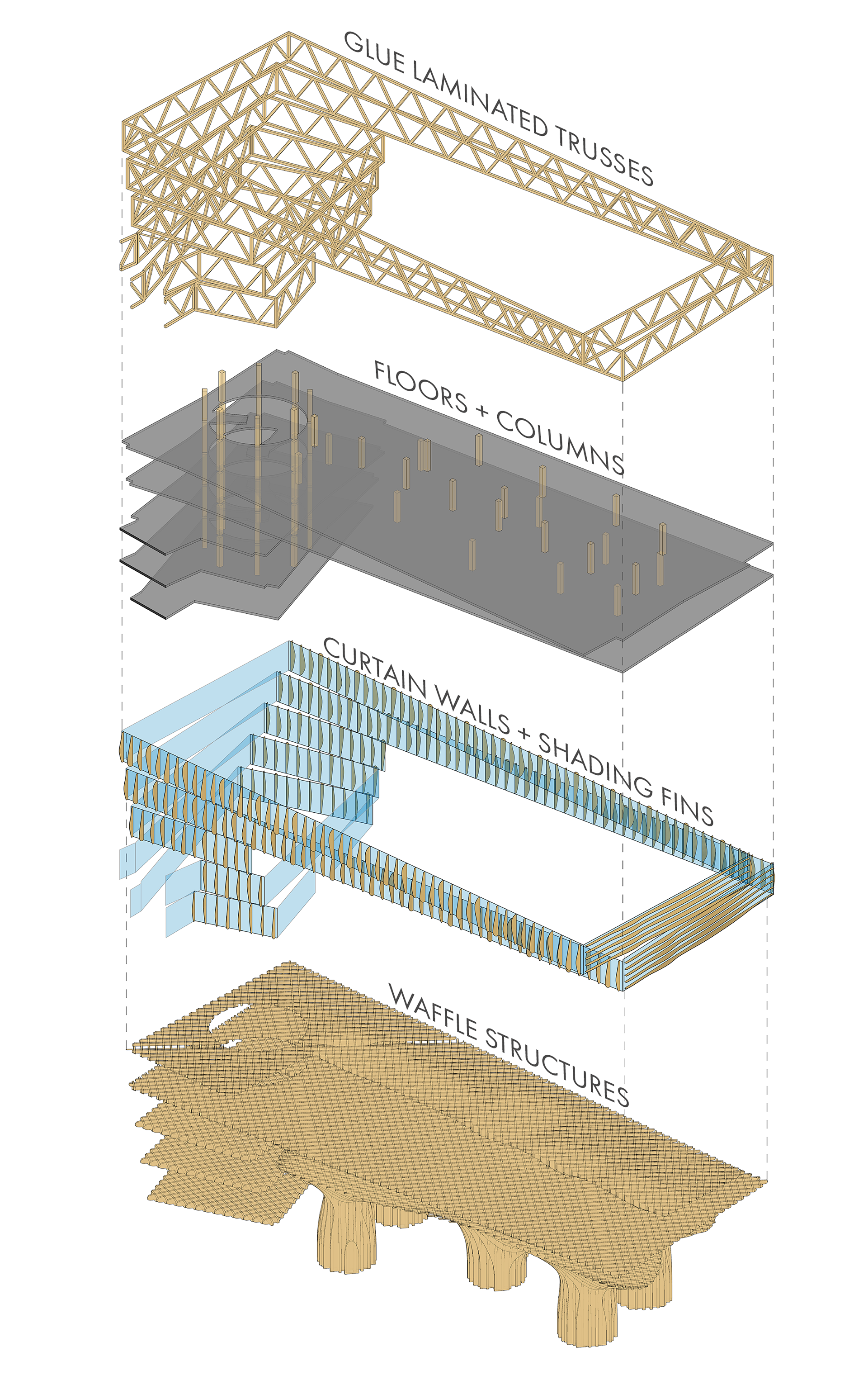 The glue-laminated timber waffle slabs on each floor are affected by the columns on the floor above. Wherever the column lands, the waffle structure below it deepens, allowing the structure to transfer the loads to the columns on that floor. This allows the building to twist, without having a continuous series of columns throughout each floor of the building.